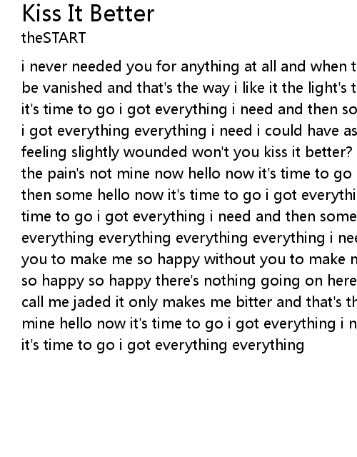 i never needed you for anything at all and when the light comes you know i will be vanished and that's the way i like it the light's too bright here hello now it's time to go i got everything i need and then some hello now it's time to go i got everything everything i need i could have asked ? anything at all i'm feeling slightly wounded won't you kiss it better? yeah that's the way i like it the pain's not mine now hello now it's time to go i got everything i need and then some hello now it's time to go i got everything everything hello now it's time to go i got everything i need and then some hello now it's time to go i got everything everything everything everything i need to make me so happy without you to make me so happy without you to make me so happy without you to make me so happy so happy there's nothing going on here not a thing at all go on and call me jaded it only makes me bitter and that's the way i like it cos i've got mine hello now it's time to go i got everything i need and then some hello now it's time to go i got everything everything |
