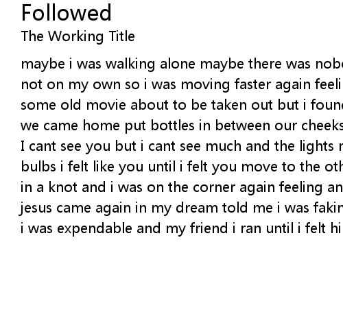 | I cant see you but i cant see much and the lights retreated back inside their bulbs i felt like you until i felt you move to the other room workin had me tied in a knot and i was on the corner again feeling anxious waiting around then jesus came again in my dream told me i was fakin my life like some old movie and i was expendable and my friend i ran until i felt him |