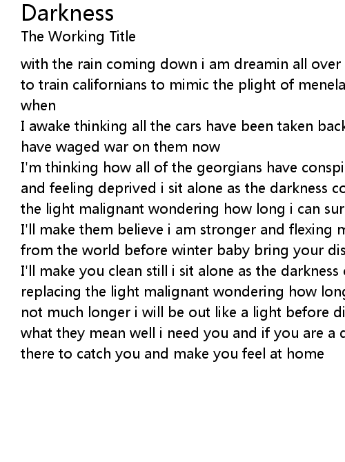 I'll make you clean still i sit alone as the darkness covers over the room replacing the light malignant wondering how long i can survive alone well its not much longer i will be out like a light before dinner oh no one gets to say what they mean well i need you and if you are a dear and running...then i'm out there to catch you and make you feel at home |