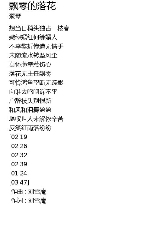 | [01:03] | luò huā wú zhǔ rèn piāo líng |