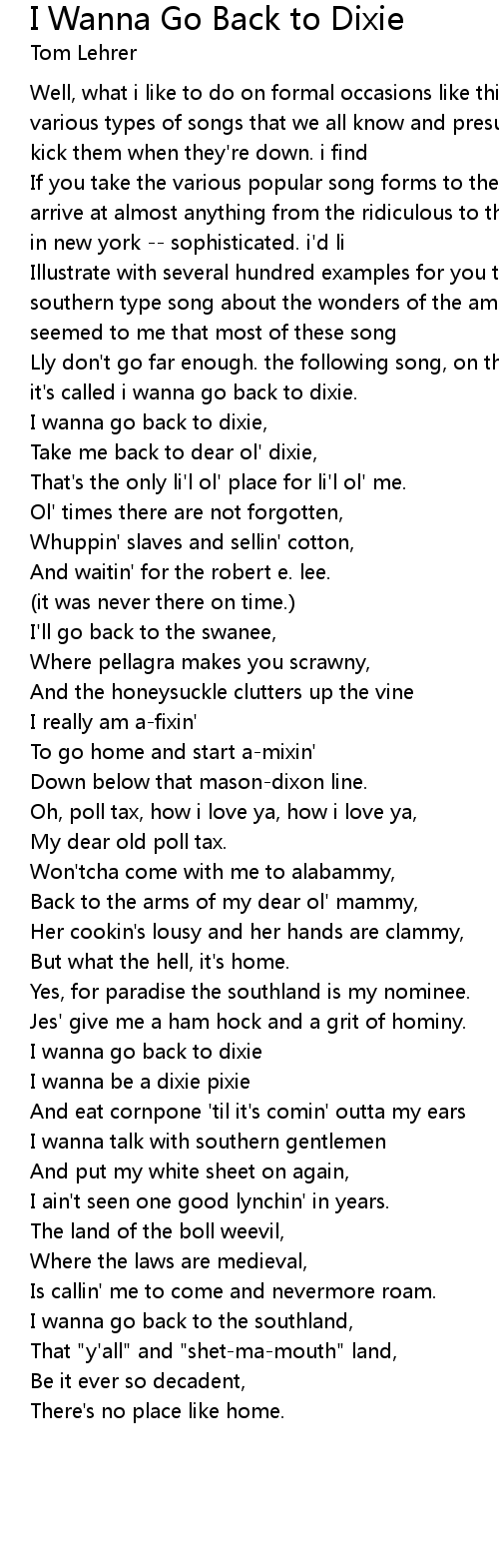 Lly don't go far enough. the following song, on the other hand, goes too far. it's called i wanna go back to dixie. |