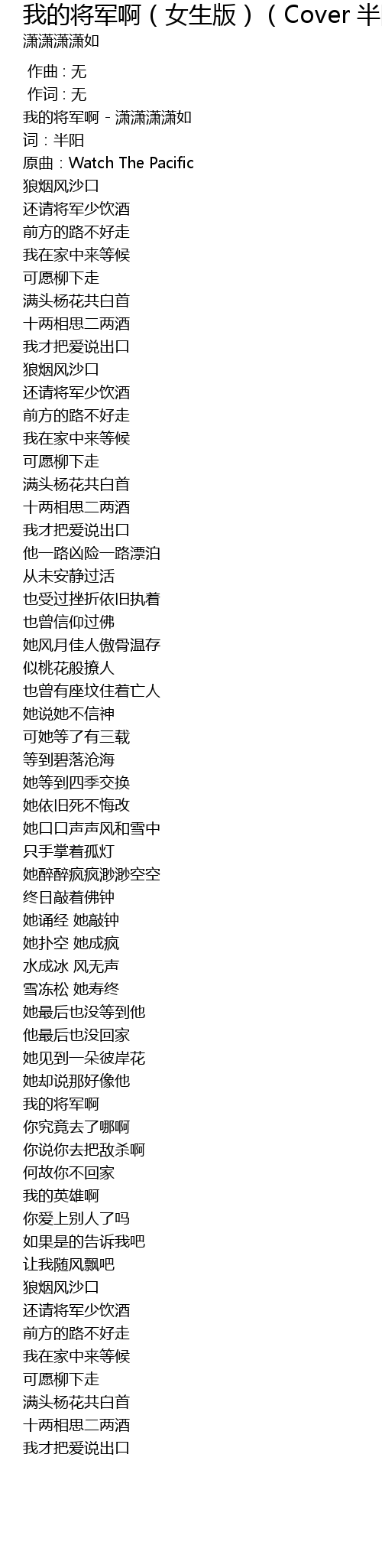 | [00:00.25] | 我的将军啊 - 潇潇潇潇如 |