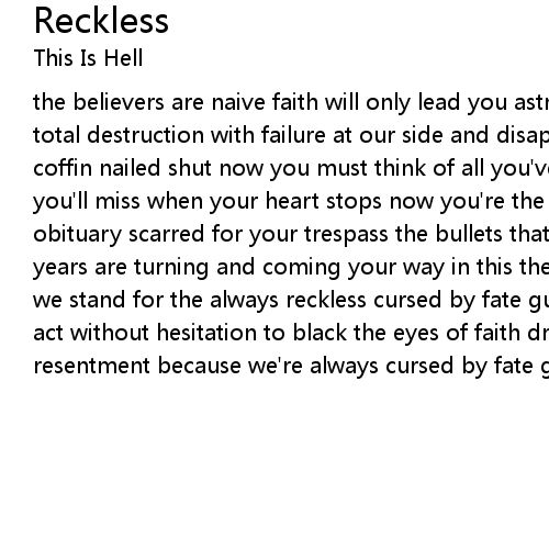the believers are naive faith will only lead you astray standing on the brink of total destruction with failure at our side and disappointment in our looks the coffin nailed shut now you must think of all you've taken for granted and what you'll miss when your heart stops now you're the victim writing your own obituary scarred for your trespass the bullets that you've dodged all these years are turning and coming your way in this the age of the weak and vulnerable we stand for the always reckless cursed by fate guided by misfortune and well act without hesitation to black the eyes of faith driven by disgust and resentment because we're always cursed by fate guided by misfortune |