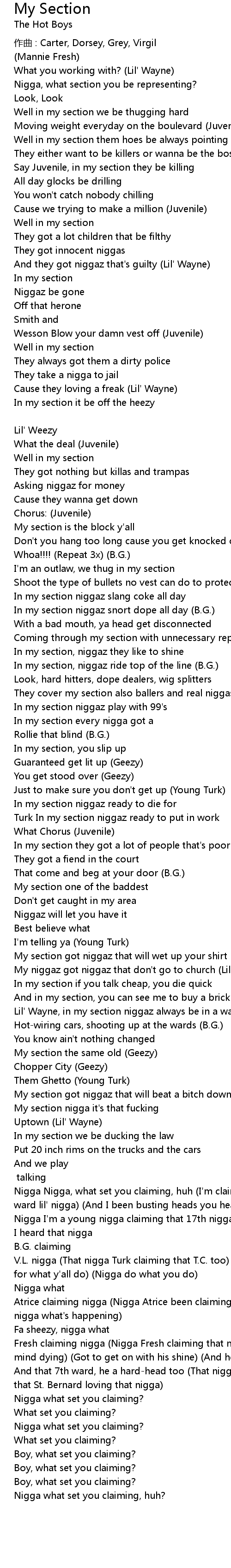 | Lil' Wayne, in my section niggaz always be in a war | |