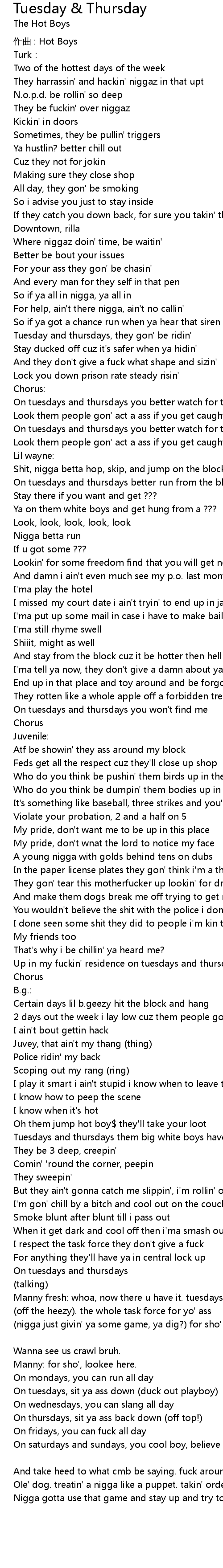 | Tuesdays and thursdays them big white boys have a nigga spooked | |