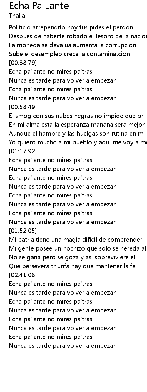 | [02:45.38] | Echa pa'lante no mires pa'tras |