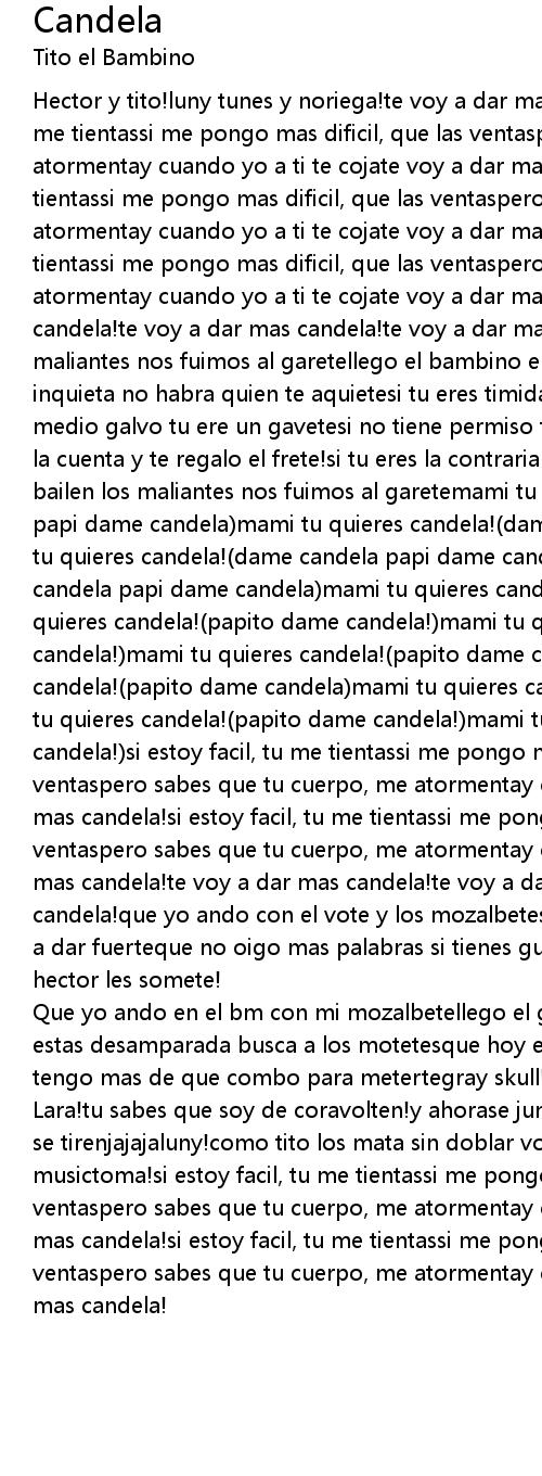 Hector y tito!luny tunes y noriega!te voy a dar mas candela!si estoy facil, tu me tientassi me pongo mas dificil, que las ventaspero sabes que tu cuerpo, me atormentay cuando yo a ti te cojate voy a dar mas candela!si estoy facil, tu me tientassi me pongo mas dificil, que las ventaspero sabes que tu cuerpo, me atormentay cuando yo a ti te cojate voy a dar mas candela!si estoy facil, tu me tientassi me pongo mas dificil, que las ventaspero sabes que tu cuerpo, me atormentay cuando yo a ti te cojate voy a dar mas candela!te voy a dar mas candela!te voy a dar mas candela!te voy a dar mas candela!que bailen los maliantes nos fuimos al garetellego el bambino el que mas le metesi estas inquieta no habra quien te aquietesi tu eres timida pa` que prometes!y si yo soy medio galvo tu ere un gavetesi no tiene permiso te pongo el malgueteyo corro con la cuenta y te regalo el frete!si tu eres la contraria yo soy el guilleteque bailen los maliantes nos fuimos al garetemami tu quiere candela!(dame candela papi dame candela)mami tu quieres candela!(dame candela papi dame candela)mami tu quieres candela!(dame candela papi dame candela)mami tu quieres candela!(dame candela papi dame candela)mami tu quieres candela!(papito dame candela)mami tu quieres candela!(papito dame candela!)mami tu quieres candela!(papito dame candela!)mami tu quieres candela!(papito dame candela!)mami tu quieres candela!(papito dame candela)mami tu quieres candela!(papito dame candela!)mami tu quieres candela!(papito dame candela!)mami tu quieres candela!(papito dame candela!)si estoy facil, tu me tientassi me pongo mas dificil, que las ventaspero sabes que tu cuerpo, me atormentay cuando yo a ti te cojate voy a dar mas candela!si estoy facil, tu me tientassi me pongo mas dificil, que las ventaspero sabes que tu cuerpo, me atormentay cuando yo a ti te cojate voy a dar mas candela!te voy a dar mas candela!te voy a dar mas candela!te voy a dar mas candela!que yo ando con el vote y los mozalbetespegate y no frontes, que te voy a dar fuerteque no oigo mas palabras si tienes guilleteme gusta tu amigas, si hector les somete! |