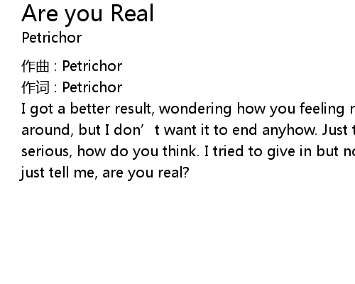 | I got a better result, wondering how you feeling now. I got a better answer around, but I don' t want it to end anyhow. Just tell me are you real. Any serious, how do you think. I tried to give in but now I don' t dare to be. So just tell me, are you real? |
