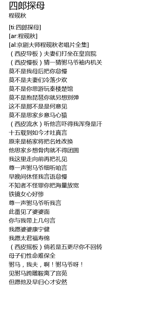 | [00:00.00] | (西皮导板)夫妻们打坐在皇宫院 |