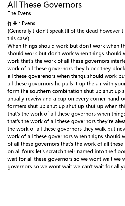 | When things should work but don't work when things should work when things should work but don't work when things should when things should work but don't work that's the work of all these governors interference by decree thats the work of all these governors they block they block they block thats the work of all these goverenors when things should work but don't work that's the work of all these govornors he pulls it up the air with your information panels that form the southern combination shut up shut up shut up shut up shut up shut up anually reveiw and a cup on every corner hand out rewards for snitching on a formers shut up shut up shut up shut up when things should work but don't work that's the work of all these governors when things should work but don't work that's the work of all these governors they're always looking after me that's the work of all these governors they walk but never for the distance thats the work of all these governors when thigns should work but dont work thats the work of all these governors that's the work of all these governors while we're down on all fours let's scratch their named into the floor so we wont wait we wont wait for all these governors so we wont wait we wont wait for all these governors so we wont wait we can't wait for all you governors |