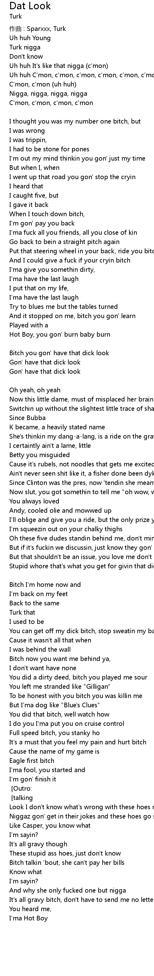 | Stupid whore that's what you get for givin that dick look (uh oh!) [Chorus] [Verse 3: Turk] | |