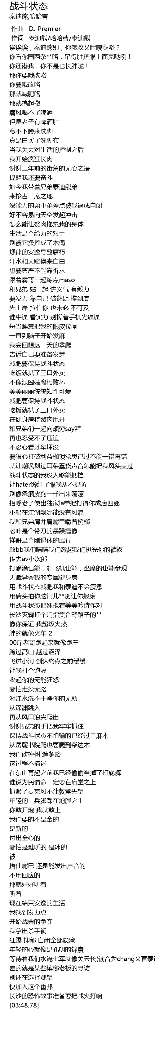| [01:17.77] | jiǎn féi yào bǎo chí zhàn dòu zhuàng tài |