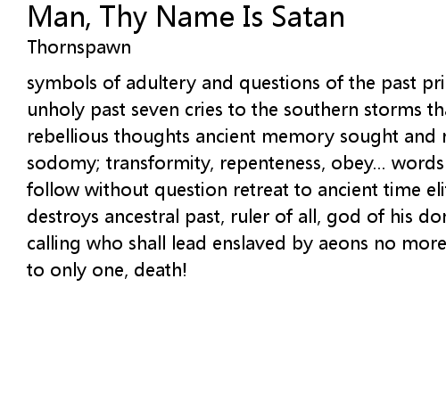 symbols of adultery and questions of the past primordial thoughts of man's unholy past seven cries to the southern storms that feeds and whispers rebellious thoughts ancient memory sought and released of brutality, perversion, sodomy; transformity, repenteness, obey... words of the cloth reason by force to follow without question retreat to ancient time elite species that dominates and destroys ancestral past, ruler of all, god of his domain the great battle, the calling who shall lead enslaved by aeons no more man, thy name is satan mortal to only one, death! |