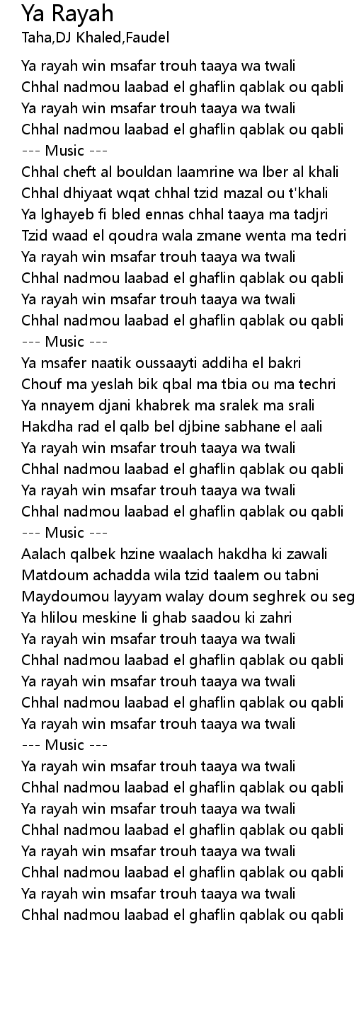 | [05:32.36] | Ya rayah win msafar trouh taaya wa twali |