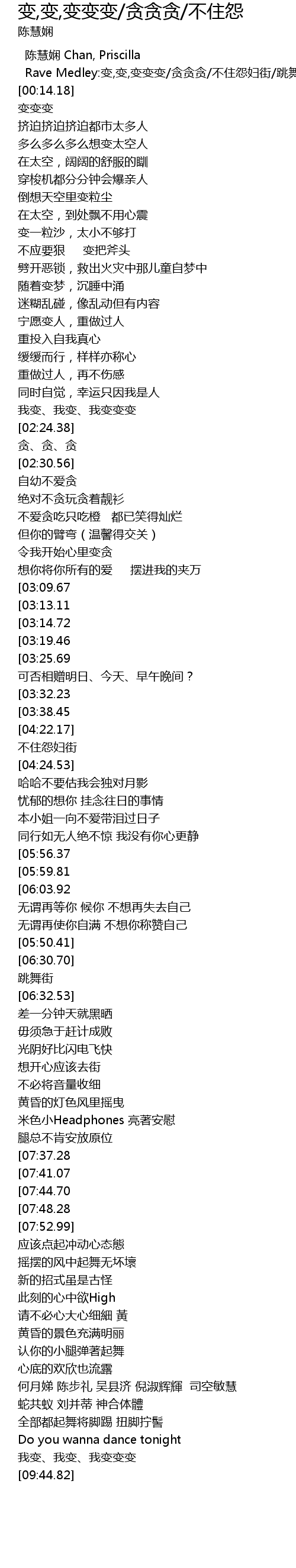 | [00:08.18] | Rave Medley: biàn, biàn, biàn biàn biàn tān tān tān bú zhù yuàn fù jiē tiào wǔ jiē |
