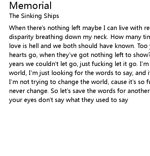 When there's nothing left maybe I can live with regret, but not with the disparity breathing down my neck. How many times have we tried to let go, when love is hell and we both should have known. Too young to know. Where do our hearts go, when they've got nothing left to show? Too young to know. For all the years we couldn't let go, just fucking let it go. I'm not trying to change the world, I'm just looking for the words to say, and it's so fucking hard to say. I'm not trying to change the world, cause it's so fucking hard, cause you'll never change. So let's save the words for another day. You've grown so cold and your eyes don't say what they used to say |