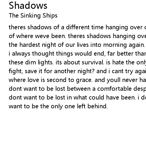 theres shadows of a different time hanging over our heads. lost in the memories of where weve been. theres shadows hanging over our heads. as five a.m. turns the hardest night of our lives into morning again. why is it so hard to let go? i always thought things would end, far better than this. an easy goodbye under these dim lights. its about survival. is hate the only way to save another fight, save it for another night? and i cant try again, and move onto a place where love is second to grace. and youll never have to see my fucking face. i dont want to be lost between a comfortable desperation and a saving grace. i dont want to be lost in what could have been. i dont want to be lost. i dont want to be the only one left behind. |