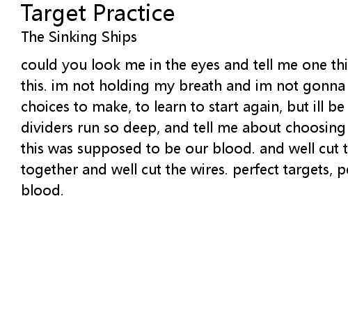 | could you look me in the eyes and tell me one thing i could have done to change this. im not holding my breath and im not gonna wait for shit. we have our choices to make, to learn to start again, but ill be damned if ive ever seen the dividers run so deep, and tell me about choosing sides and all ill ask is why? this was supposed to be our blood. and well cut the wires that hold ourselves together and well cut the wires. perfect targets, perfect lies. this was our blood. |