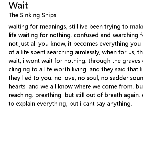 waiting for meanings, still ive been trying to make some sense. al this wasting life waiting for nothing. confused and searching for so long that sometimes its not just all you know, it becomes everything you are. trying to make some sense of a life spent searching aimlessly, when for us, this is everything. i wont wait, i wont wait for nothing. through the graves of what weve been through clinging to a life worth living. and they said that life is what you choose and they lied to you. no love, no soul, no sadder sound than the crushing of our hearts. and we all know where we come from, but were never going home. trying. reaching. breathing. but still out of breath again. out of words again, trying to explain everything, but i cant say anything. |