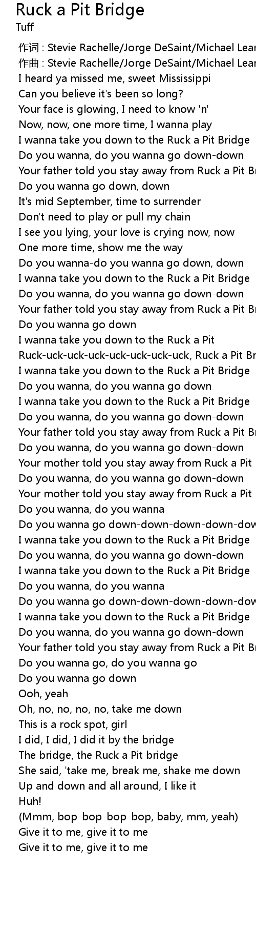 | [01:32.500] | Ruck-uck-uck-uck-uck-uck-uck-uck, Ruck a Pit Bridge, yeah! |