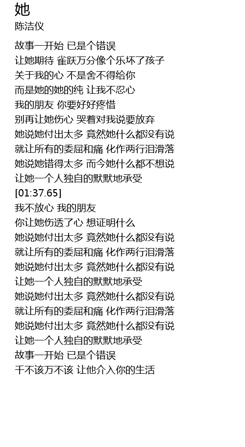 | [02:41.77] | 她说她付出太多 竟然她什么都没有说 |