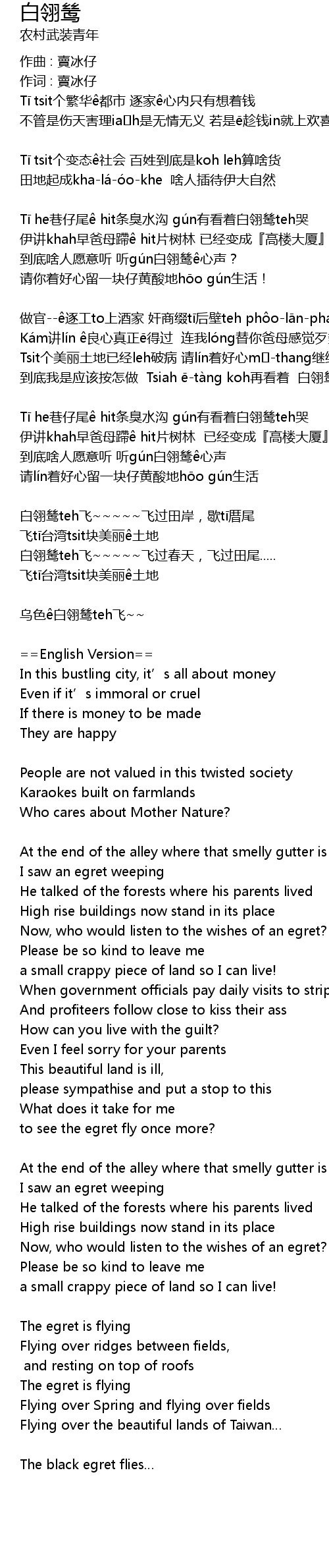 | 白翎鸶teh飞~~~~~飞过田岸,歇tī厝尾 | |
