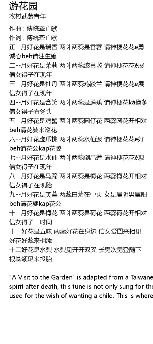 | "A Visit to the Garden" is adapted from a Taiwanese folk song for leading the spirit after death, this tune is not only sung for the dead, but can also be used for the wish of wanting a child. This is where life crosses death. |