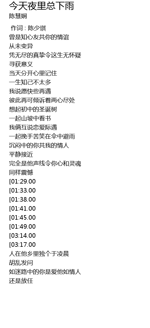| [03:25.00][03:17.00][01:56.00] | 今天你可知道夜里总下雨 |