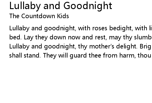 | Lullaby and goodnight, thy mother's delight. Bright angels around my darling shall stand. They will guard thee from harm, thou shalt wake in my arms (x2) |