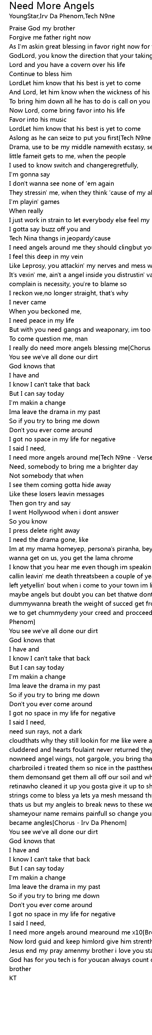 I need more angels around me[Tech N9ne - Verse 3]need sun rays, not a dark cloudthats why they still lookin for me like were art thouohh brotha, they so cluddered and hearts foulaint never returned they call and they bout to start nowneed angel wings, not gargole, you bring that beef to meget ready to get charbroiled i treated them so nice in the pastthese people are spoiled reject them demonsand get them all off our soil and when the smoke clears in your retinawho cleaned it up you gosta give it up to shlegnathe black boots and red strings come to bless ya lets ya mesh messand threds bash your ex-a, dust yes thats us but my angleis to break news to these webs thats so tangled such a shameyour name remains painfull so change your gamescoz we were stained but became angles[Chorus - Irv Da Phenom] |