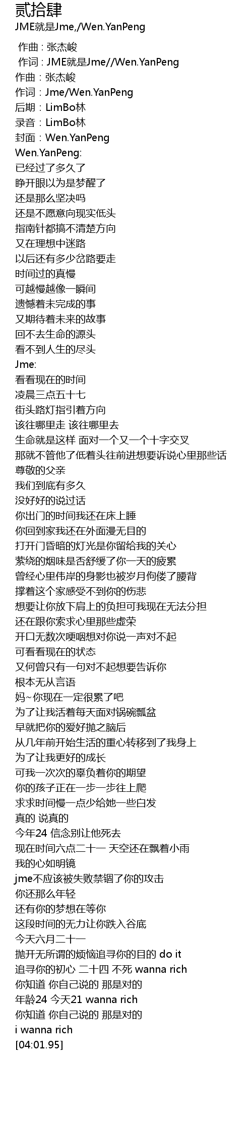 | [03:35.86] | nian ling 24 jin tian 21 wanna rich |