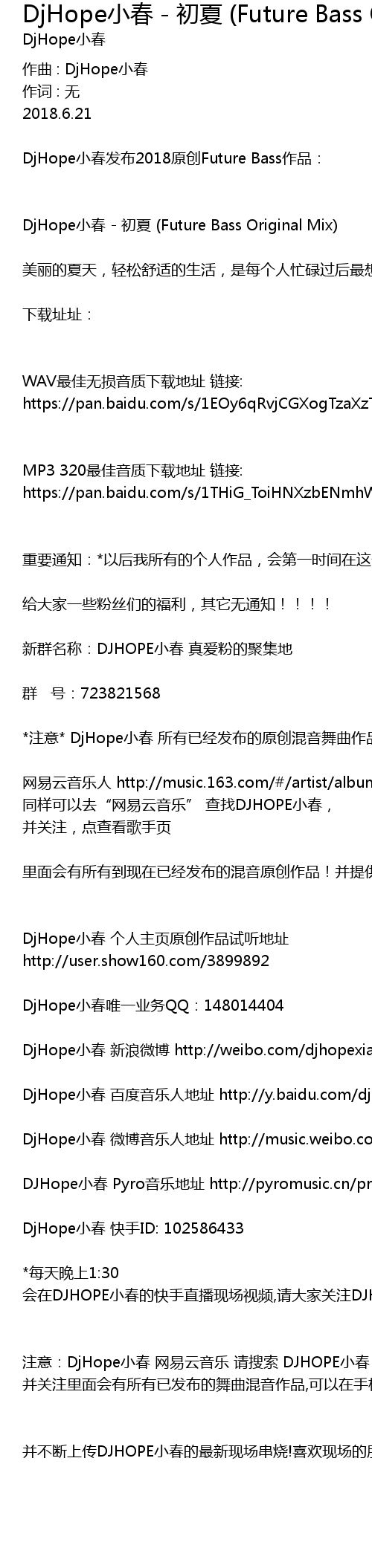 | DjHope小春 百度音乐人地址 http://y.baidu.com/djhopexiaochun | |