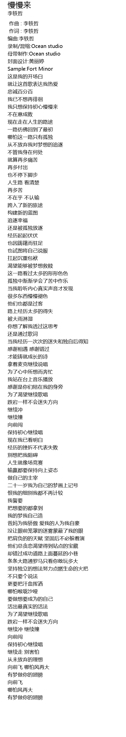 | [00:38.57] | wǒ zhǐ xiǎng bǎo chí chū xīn màn màn lái |