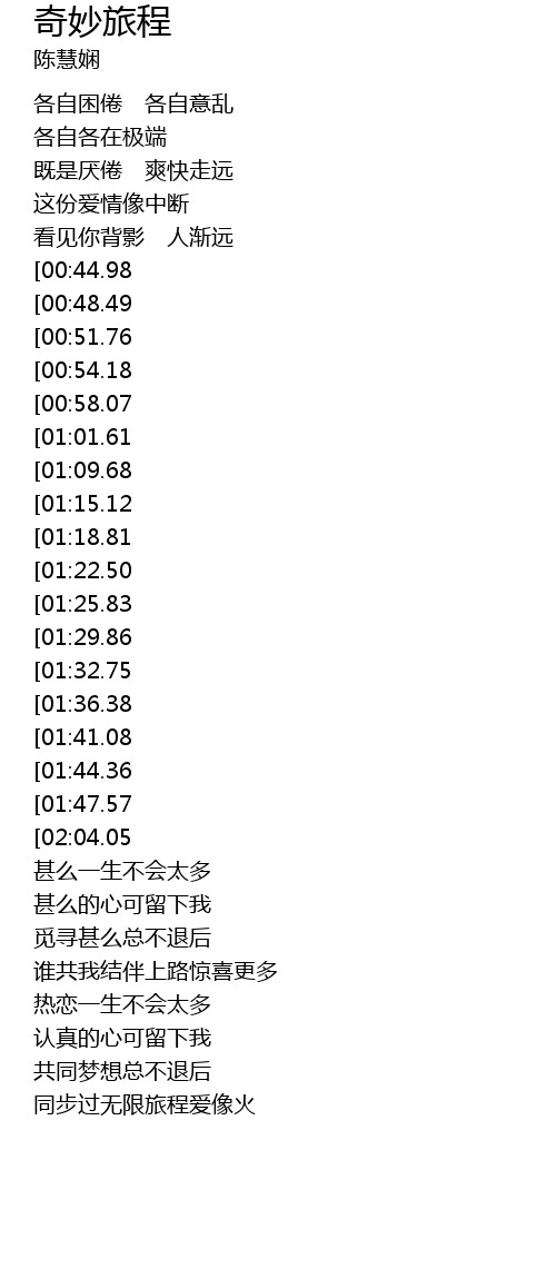 | [02:51.77][01:32.75] | 谁共我结伴上路惊喜更多 |