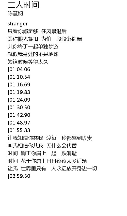 | [03:53.22] | 让我 世界里只有二人永远放开身边一切 |