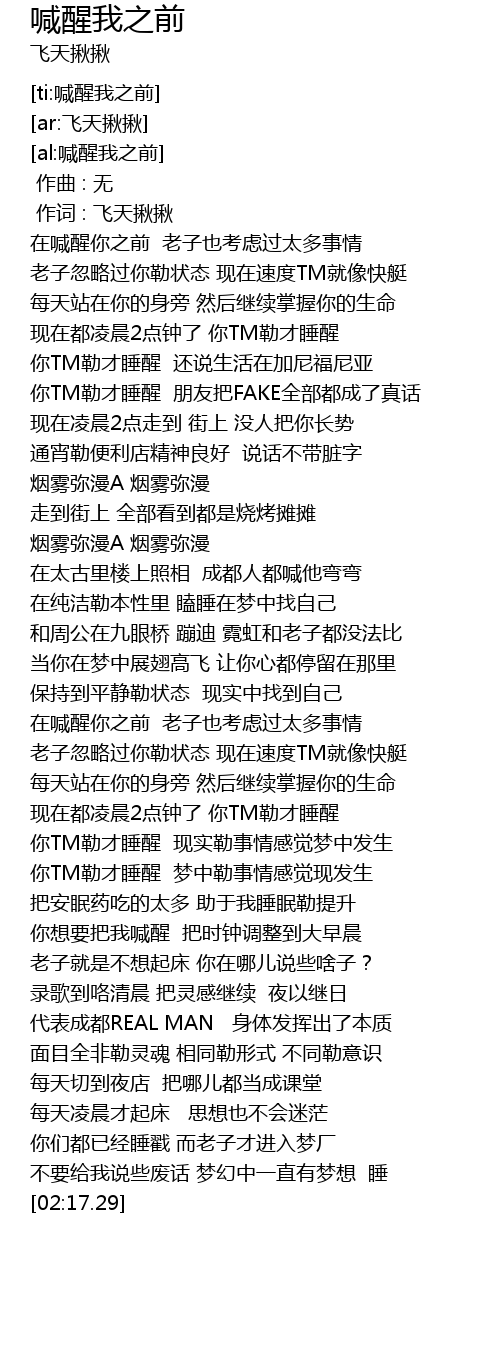 | [00:01.000] | 作词 : 飞天揪揪 |