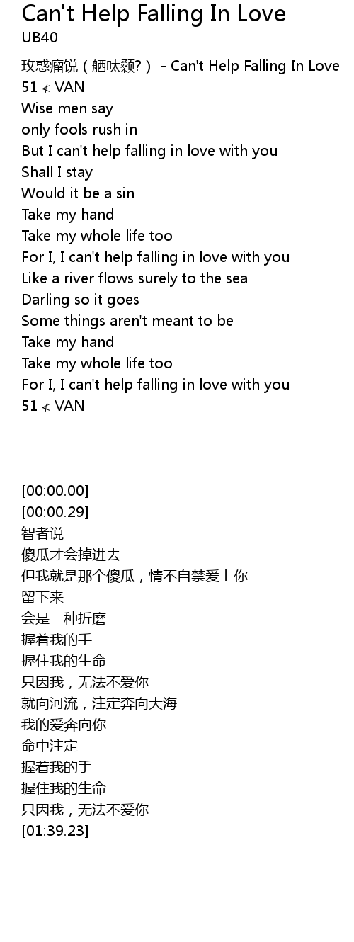 | [00:00.00] | 玫惑瘤锐(舾呔颡?) - Can't Help Falling In Love |