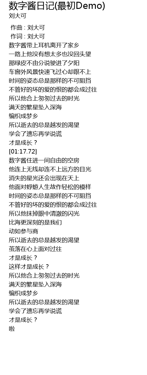 | [00:01.000] | 作词 : 刘大可 |