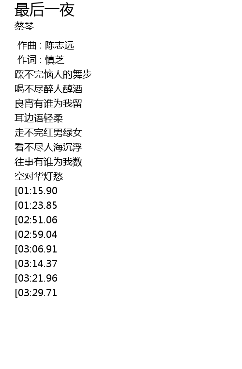 | [04:19.18][03:29.71][02:09.56] | ēn zuì hòu yī yè |