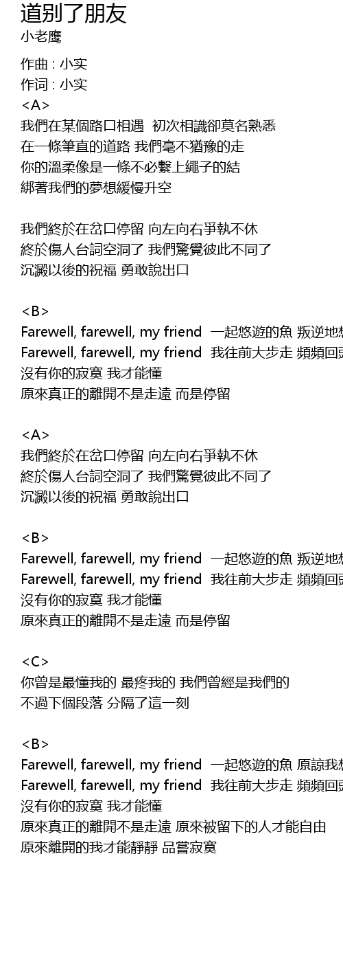| Farewell, farewell, my friend 我往前大步走 頻頻回頭 | |