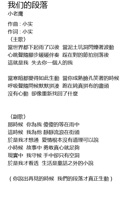 | 呼吸聲隨問候默默拼湊 跑在純真拼布的盡頭 | |