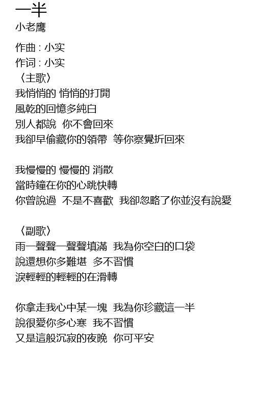 | 你拿走我心中某一塊 我為你珍藏這一半 | |