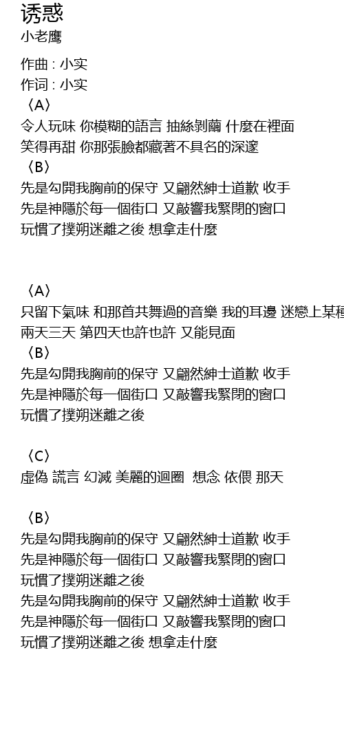 | 只留下氣味 和那首共舞過的音樂 我的耳邊 迷戀上某種謊言 | |