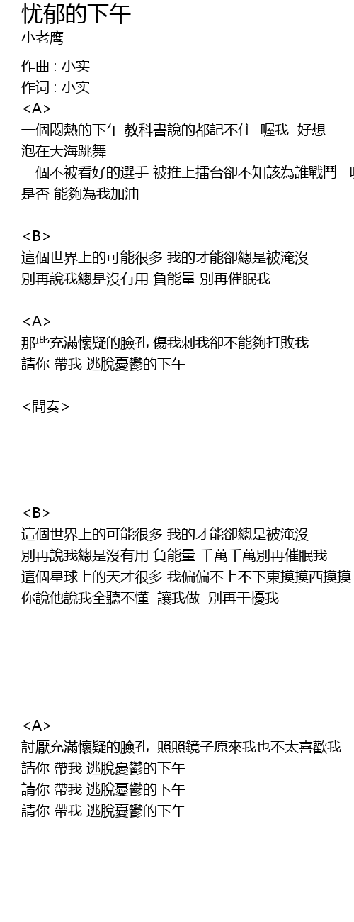 | 一個悶熱的下午 教科書說的都記不住 喔我 好想 泡在大海跳舞 | |
