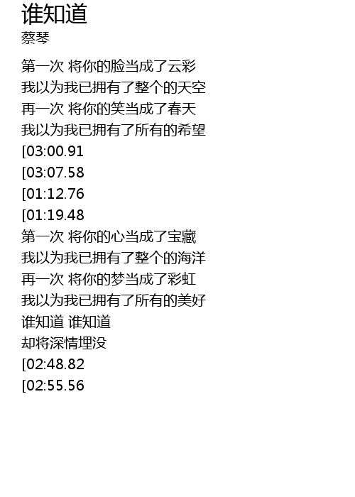 | [03:12.83][01:12.76] | 谁知道 谁知道 |