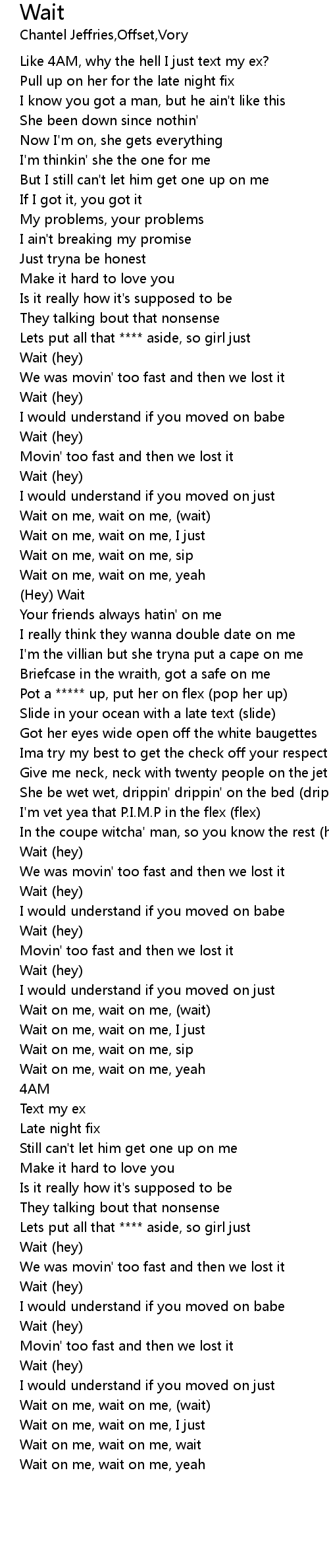 Wait on me, wait on me, wait |