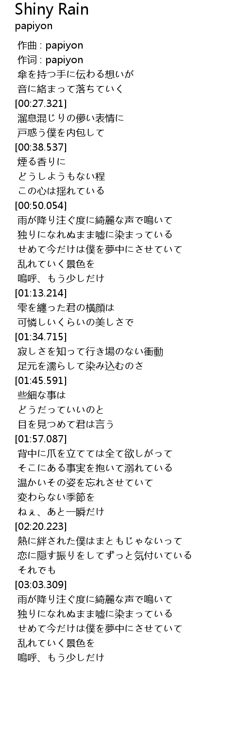 | [03:03.929] | 雨が降り注ぐ度に綺麗な声で鳴いて |