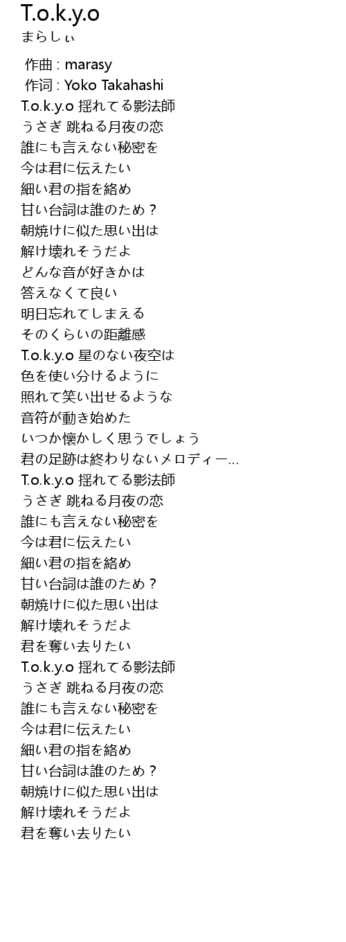 | [00:20.28] | T.o.k.y.o 揺れてる影法師 |