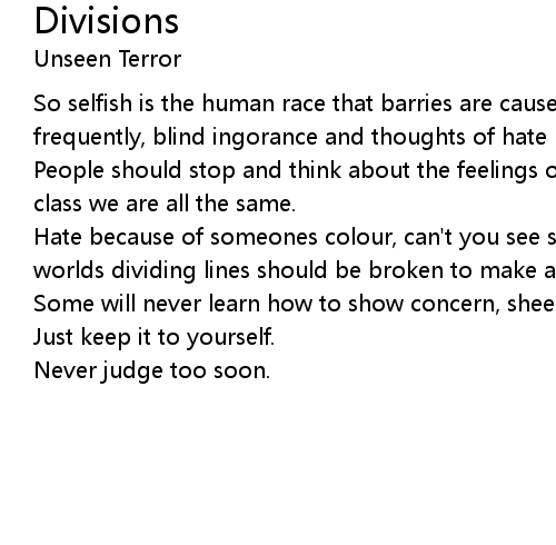 Hate because of someones colour, can't you see some sense? - blindness, todays worlds dividing lines should be broken to make a better world - today. |