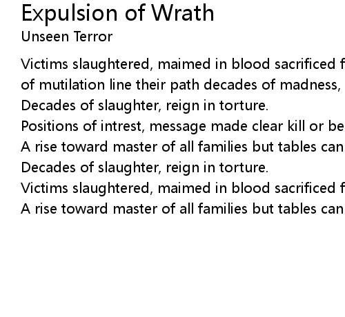 Victims slaughtered, maimed in blood sacrificed for power and all it does trails of mutilation line their path decades of madness, expulsion on wrath. |